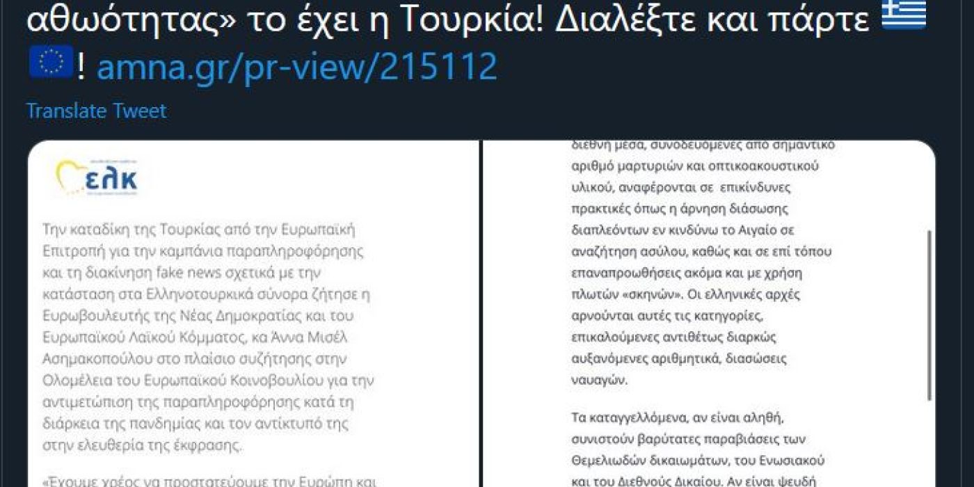 Σε μια ερώτηση που ζητά από την ΕΕ ουσιαστικά να προστατεύσει την Ελλάδα από τα προπαγανδιστικά παιχνίδια της Άγκυρας, η κυρία Άννα Μισέλ βλέπει φίλους της Τουρκίας; Αν θέλει να βρει φίλους της Τουρκίας ας κοιτάξει στο κόμμα της, στην παράταξή της, στην ηγεσία της Ευρωπαϊκής Δεξιάς που στο σώου του Έβρου έταξαν στον Κυριάκο Μητσοτάκη και την κυβέρνησή του μερικές εκατοντάδες εκατομμύρια για να κάνει την Ελλάδα φυλακή προσφύγων και μεταναστών και όχι στην Αριστερά που δεν έχει σταματήσει ούτε στιγμή στο Ευρωπαϊκό Κοινοβούλιο να πιέζει με κάθε τρόπο για να πετύχει την πολιτική καταδίκη της Άγκυρας και καταγγέλλει με κάθε ευκαιρία τους τυχοδιωκτισμούς Ερντογάν σε βάρος της χώρας μας, και στον Έβρο και παντού. Στο ΕΛΚ, στην δική της Ευρωπαϊκή παράταξη, θα βρει τους πιο πιστούς, τους πιο φανατικούς φιλους της Τουρκίας, και όχι στην Αριστερά.H Κυρία Άννα Μισέλ Ασημακοπούλου, ευρωβουλευτής της ΝΔ , του κόμματος που ως αντιπολίτευση θεωρούσε πιο αξιόπιστο τον Ερντογάν από τον Έλληνα πρωθυπουργό, της ΝΔ που παρακολουθεί ατάραχη την Ευρωπαϊκή ηγεσία να χαϊδεύει τις επικίνδυνες χορογραφίες του «Σουλτάνου» στην Ανατολική Μεσόγειο και να αποκαλεί την Τουρκία «φίλη χώρα», ανακάλυψε «τεκμήριο αθωότητας» για τη γειτονική χώρα σε μια ερώτηση που μιλά καθαρά για την τουρκική προπαγάνδα που «επιχειρεί να εκθέσει την Ελλάδα σε ένα ζήτημα με καθαρά ευρωπαϊκή διάσταση, και μάλιστα στην περιοχή όπου βρίσκεται σε πλήρη εξέλιξη η επιχείρηση POSEIDON».