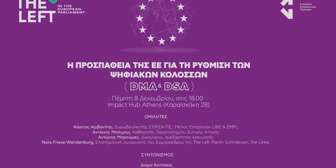 Εκδήλωση Τhe Left & ΕΝΑ: «DMA & DSA: Η προσπάθεια της ΕΕ για τη ρύθμιση των ψηφιακών κολοσσών»