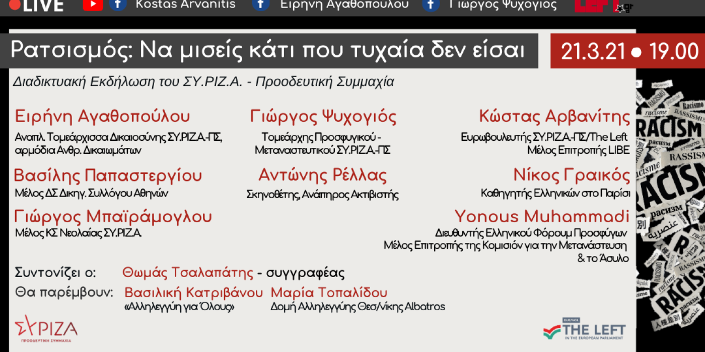 Την 21η Μαρτίου, Ημέρα κατά του Ρατσισμού και του Φασισμού και Ημέρα Ποίησης, ο ΣΥΡΙΖΑ-Προοδευτική Συμμαχία, με πρωτοβουλία της αναπλ. τομεάρχισσας Δικαιοσύνης αρμόδιας Ανθρωπίνων Δικαιωμάτων, Ειρήνης Αγαθοπούλου, του τομεάρχη Μεταναστευτικού-Προσφυγικού, Γιώργου Ψυχογιού και του ευρωβουλευτή, μέλους της Επιτροπής Πολιτικών Ελευθεριών, Δικαιοσύνης & Εσωτερικών Υποθέσεων (LIBE) του Ε.Κ., Κώστα Αρβανίτη, διοργανώνει διαδικτυακή εκδήλωση με θέμα: «Ρατσισμός: Να μισείς κάτι που τυχαία δεν είσαι». Στην εκδήλωση, που γίνεται στο πλαίσιο των παρεμβάσεων του Τομέα Δικαιωμάτων του ΣΥΡΙΖΑ-Προοδευτική Συμμαχία για την 21η Μαρτίου, θα συμμετέχουν δικηγόροι, κοινωνικοί ακτιβιστές, μετανάστες, μέλη του Τομέα και μέλη της Νεολαίας ΣΥΡΙΖΑ. Θα παρέμβουν ακόμη μέλη Δομών Αλληλεγγύης από την Αθήνα και τη Θεσσαλονίκη. Τη συζήτηση θα συντονίσει ο συγγραφέας Θωμάς Τσαλαπάτης. Η εκδήλωση θα μεταδοθεί ζωντανά στις 19:00 από τις σελίδες των βουλευτών και του ευρωβουλευτή στο Facebook – όπου θα μπορούν να τεθούν και γραπτές ερωτήσεις – καθώς και από το left.gr. Ομιλητές: Ειρήνη Αγαθοπούλου Γιώργος Ψυχογιός Κώστας Αρβανίτης Αντώνης Ρέλλας Νίκος Γραικός Βασίλης Παπαστεργίου Yonus Muhammadi Γιώργος Μπαϊράμογλου kostas-arvanitis-blog-ekdilosi210321