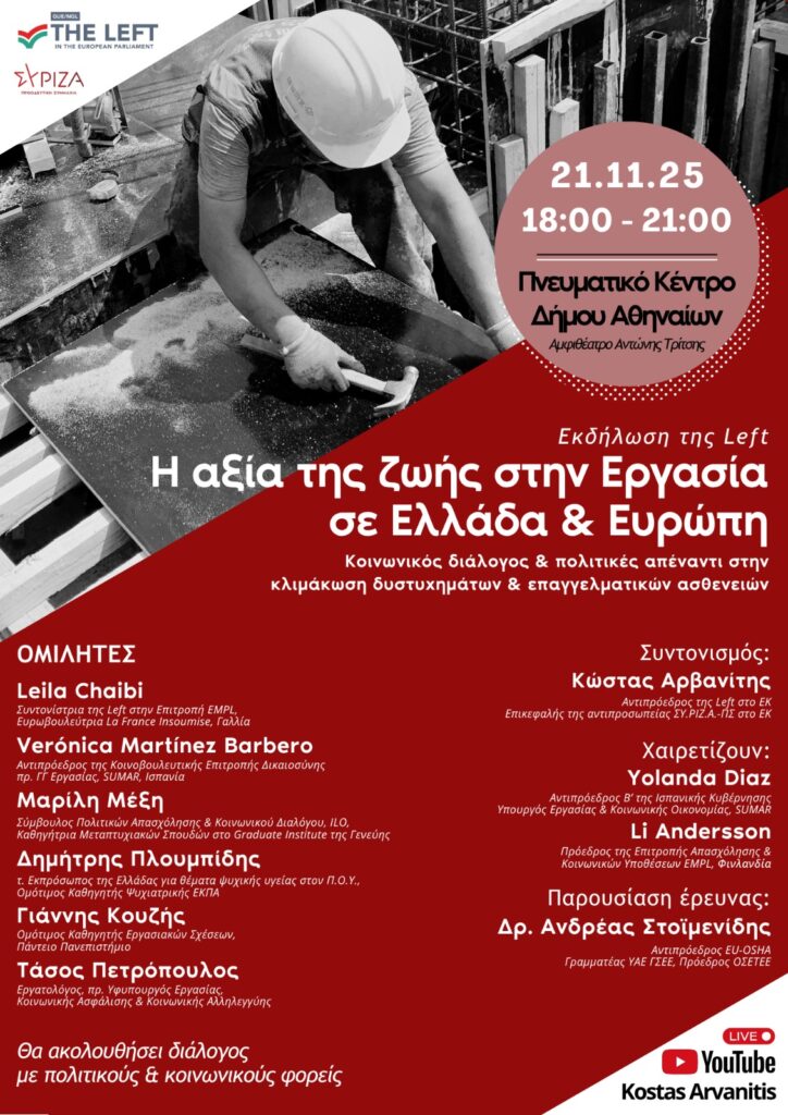Την Παρασκευή 21 Νοεμβρίου 2025, 18:00–21:00, στο Πνευματικό Κέντρο Δήμου Αθηναίων, Αμφιθέατρο Αντώνης Τρίτσης, διοργανώνεται από την πολιτική ομάδα της Αριστεράς στο Ευρωπαϊκό Κοινοβούλιο (The Left) εκδήλωση με θέμα «Η αξία της ζωής στην Εργασία σε Ελλάδα και Ευρώπη: Κοινωνικός διάλογος και πολιτικές απέναντι στην κλιμάκωση δυστυχημάτων και επαγγελματικών ασθενειών».