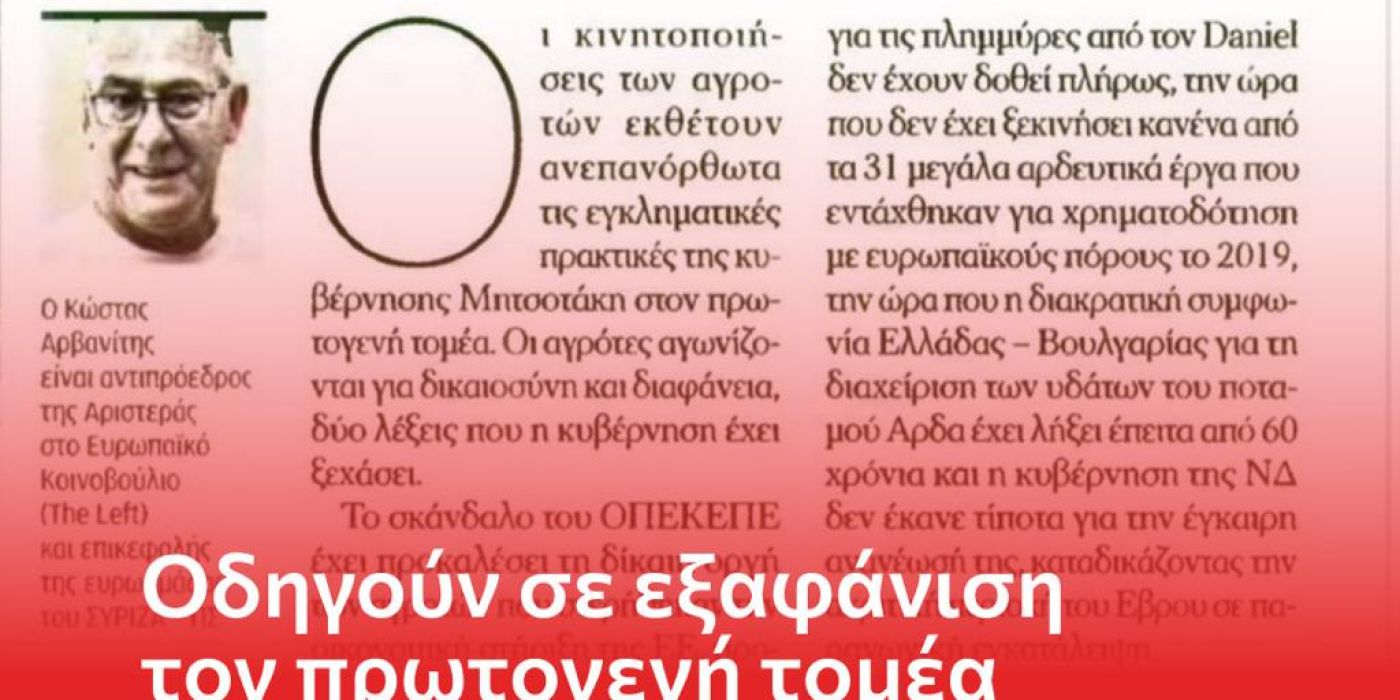 Την ώρα που οι αποζημιώσεις για τις πλημμύρες από τον Ντάνιελ δεν έχουν δοθεί πλήρως, την ώρα που δεν έχει ξεκινήσει κανένα από τα 31 μεγάλα αρδευτικά έργα που εντάχθηκαν για χρηματοδότηση με ευρωπαϊκούς πόρους το 2019, την ώρα που η διακρατική συμφωνία Ελλάδας-Βουλγαρίας για τη διαχείριση των υδάτων του ποταμού Άρδα έχει λήξει μετά από 60 χρόνια και η κυβέρνηση της ΝΔ δεν έκανε τίποτα για την έγκαιρη ανανέωσή της, καταδικάζοντας την ακριτική περιοχή του Έβρου σε παραγωγική εγκατάλειψη.